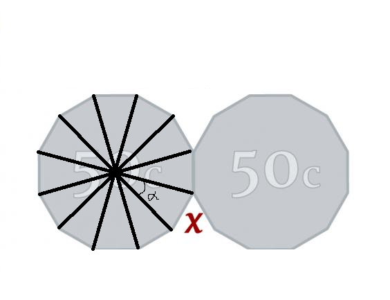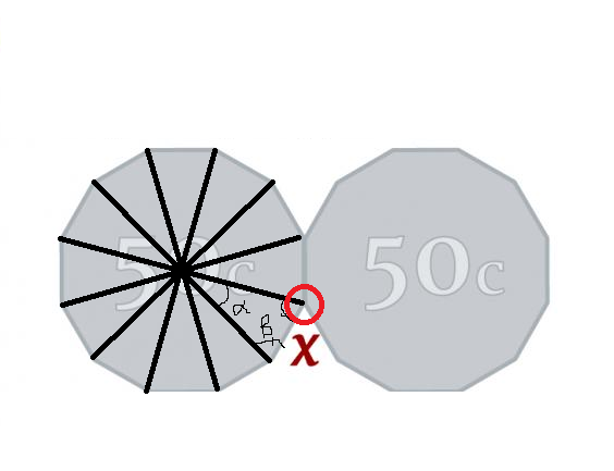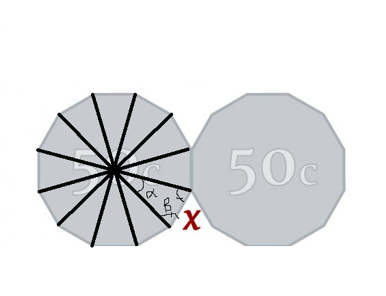 Because the center of the 50 cent coin encompasses 360 degrees, with edges that are broken off into 12 segments, you can divide 360 by 12 to get the angle of each triangle inside the coin. Let’s call that angle “alpha.”