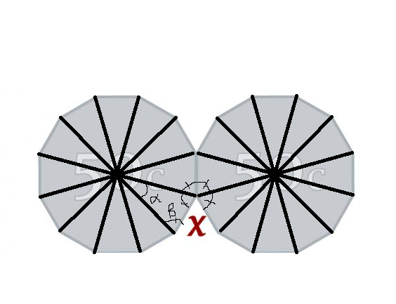 Now, you’ve made 12 triangles when you divided the coin into 12 segments. Each triangle has all three of its angles adding up to 180 degrees. So you can solve for the other 2 angles in the triangle, which will be equal. You know they’re equal because all of the triangles are the same. We’ll call the bottom two angles “beta.”